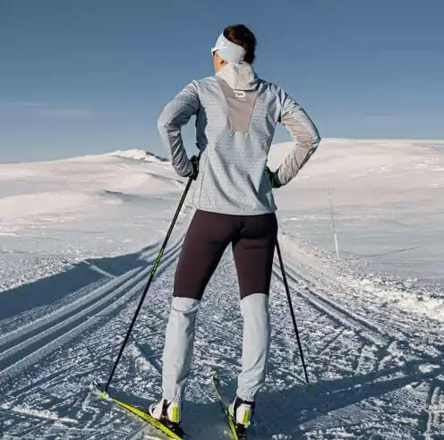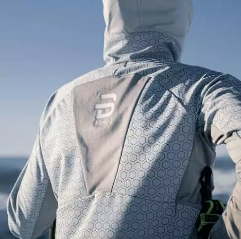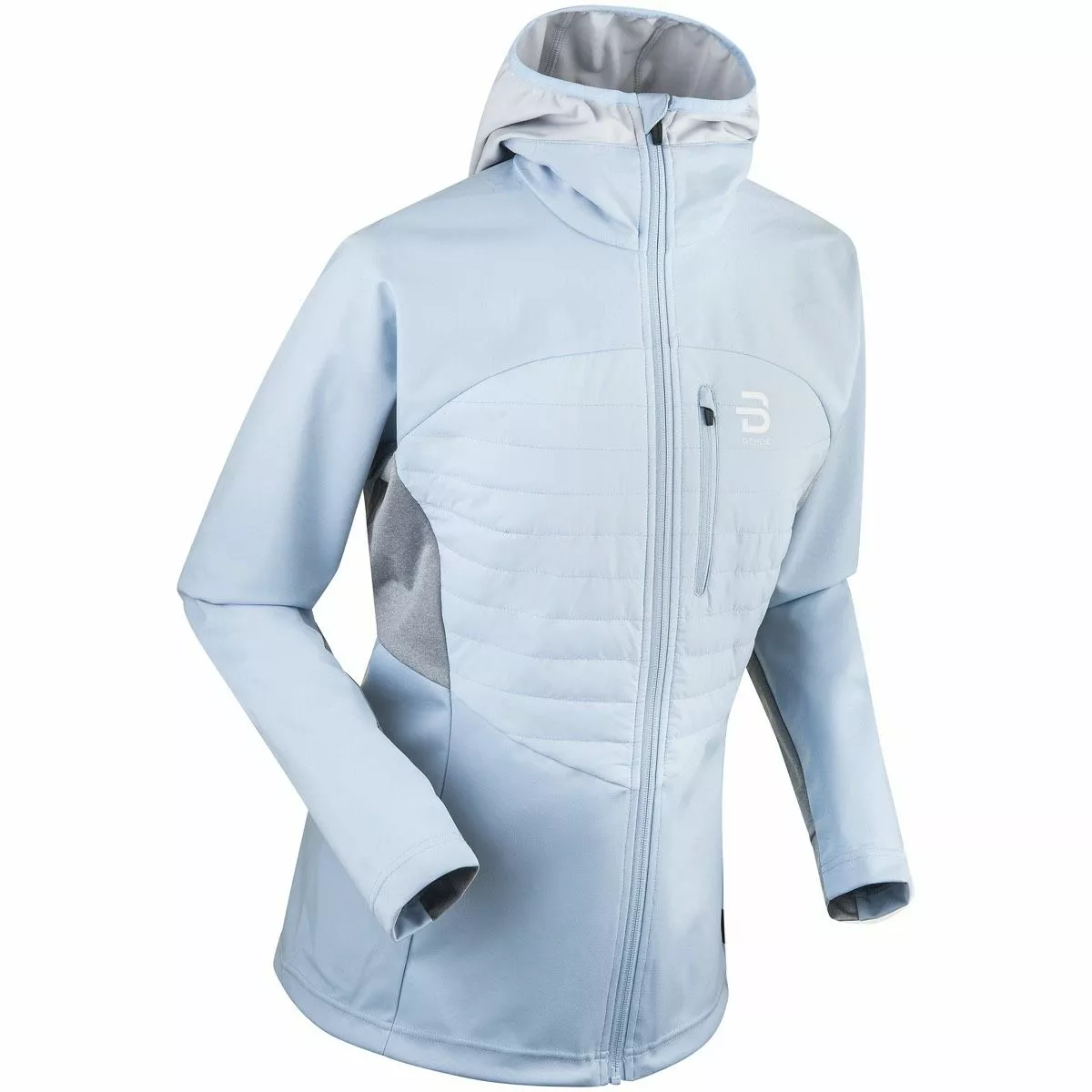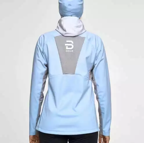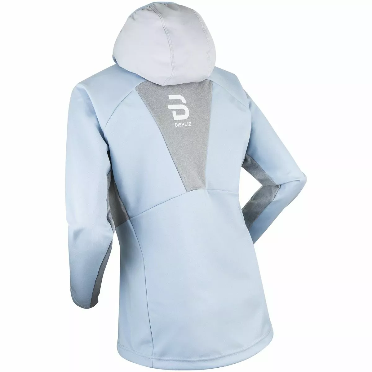 North Jacket Womens fra Dæhlie er en langrennsjakke med hette til dame, perfekt for trening med moderat intensitet. Jakken har et vind- og vannavvisende trelags softshell i front, på ermene og deler av ryggen. Med Bionic Finish Eco®-teknologi på stoffets overflate preller lett regn og sludd av, mens meshpaneler under ermene og på ryggen gir optimal ventilasjon og bevegelighet. Jakken har en høyere hals enn normalt og en lett hette med børstet innside som isolerer godt. Det er en brystlomme med glidelås, samt innvendig strammesnor nederst på jakken for individuell tilpasset passform.