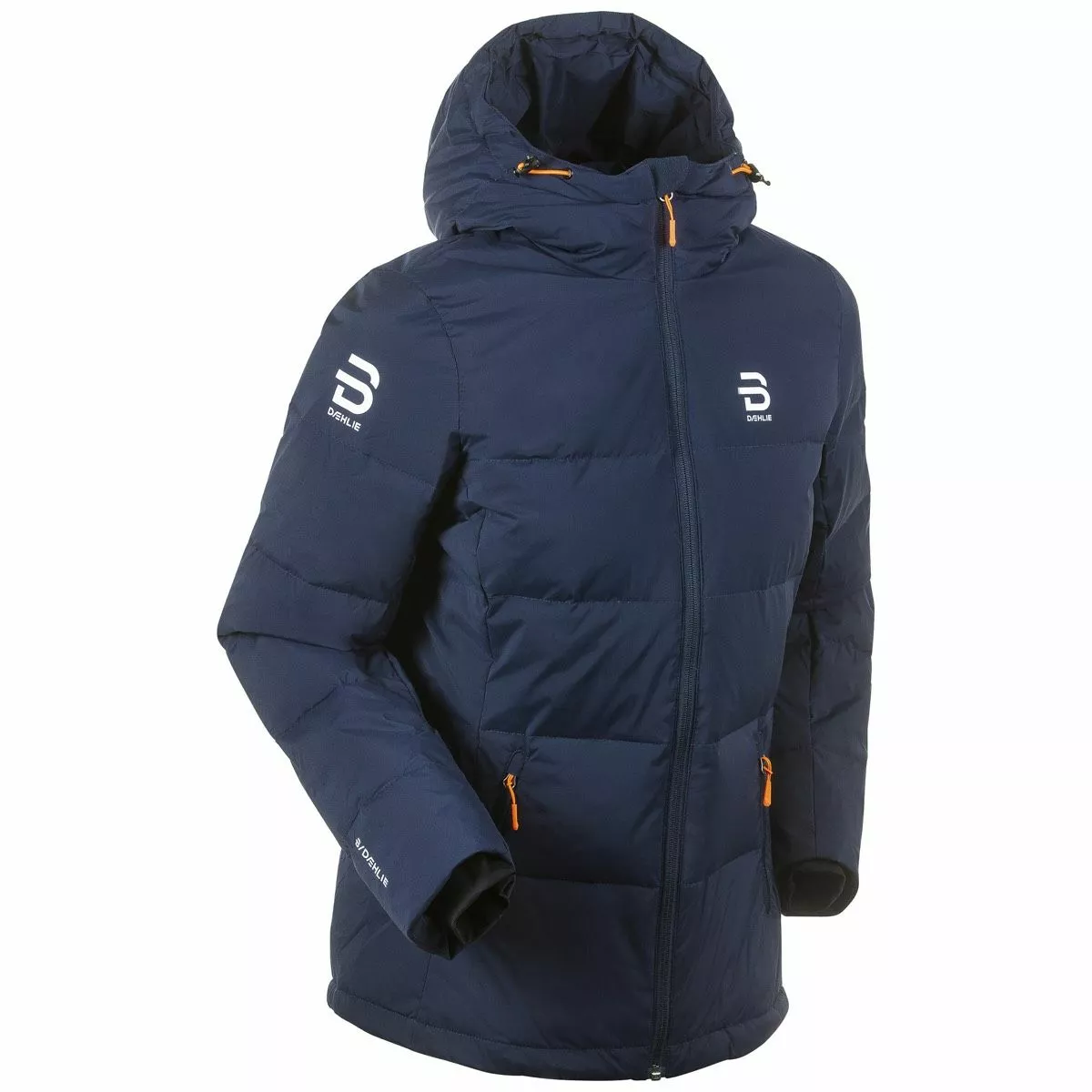 Jacket Podium er en varm og lett dunjakke fra Dæhlie for kalde vinterdager. Jakken er fóret med 60/40 andedun, og har en fillpower på 300-350. Podium er laget med elastiske mansjetter, justerbar hette, to håndlommer med glidelås og børstet innside. Passer perfekt til fritidsbruk og før og etter trening.