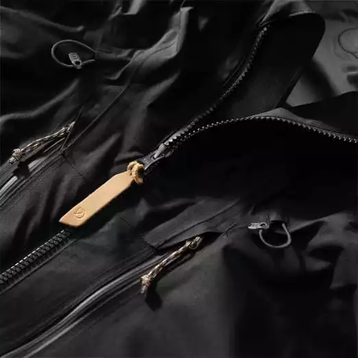Den velsittende hetten har plass til en hjelm og kan justeres for å gi god beskyttelse uten å begrense synsfeltet eller hindre hodets bevegelighet. Jakkeåpningen har en toveis vanntett glidelås med beskyttelsesklaff på innsiden, som er enkel å åpne for ventilasjon i begge ender. De romslige brystlommene med skjult belg kan nås selv når du har på deg klatresele eller ryggsekk med hoftebelte, og de har innvendige lommer i elastisk netting som holder mobiltelefonen og andre småting på plass. Jakken har også toveis glidelås i sidene som slipper ut overflødig varme, justerbar nedre kant og mansjetter.