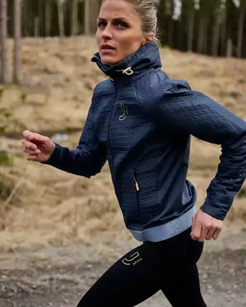 Sporty og feminin jakke med et lett og teknisk paddet material til løping eller annen utendørsaktiviteter. Jakken har en høy og justerbar krage, og strechpaneler som gir optimal pusteevne og bevegelse. Feminin og flott passform.