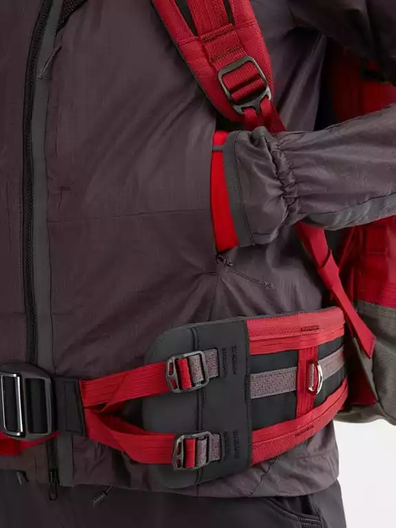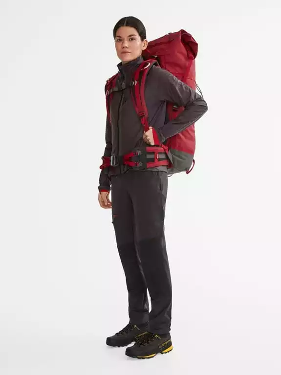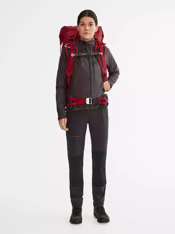 - Høyt plasserte lommer tilpasset bruk av klatresele eller ryggsekk