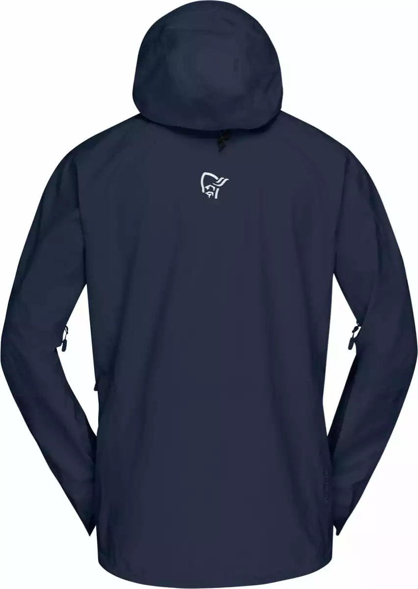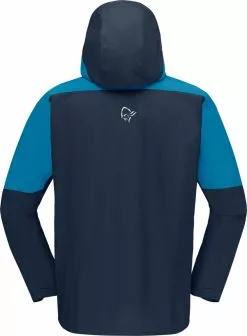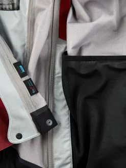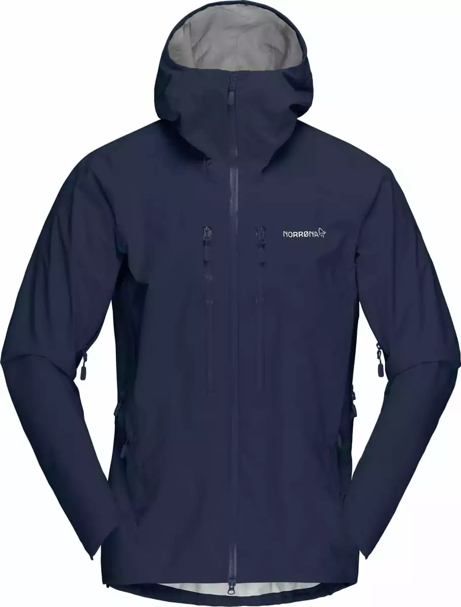 Jakken er laget i et nytt, resirkulert Gore-Tex 70D-bølgemateriale, og Norrøna har forlenget ryggen for å gi ekstra beskyttelse. Den har en lang toveis glidelås under armene for god ventilasjon. Stormhetten passer under klatrehjelm, og de store napoleonslommene på brystet er høyt plassert for å ikke komme i veien for eventuelle seler. De to stikklommene rommer plass til å legge ekstra småting og varme hendene under klatring, og de skjuler også en justeringssnor som kan stramme linningen og fange luft om nødvendig.